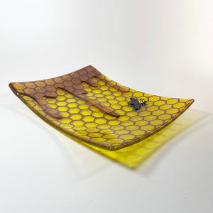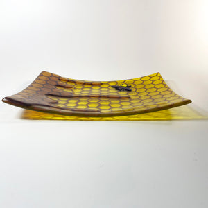 • The honeycomb pattern is painted on top of yellow translucent glass, then toped with a layer of yellow iridescent glass. This bee dish was then topped with amber glass honey & a black & gold iridescent bee, giving this piece a 3D effect.
