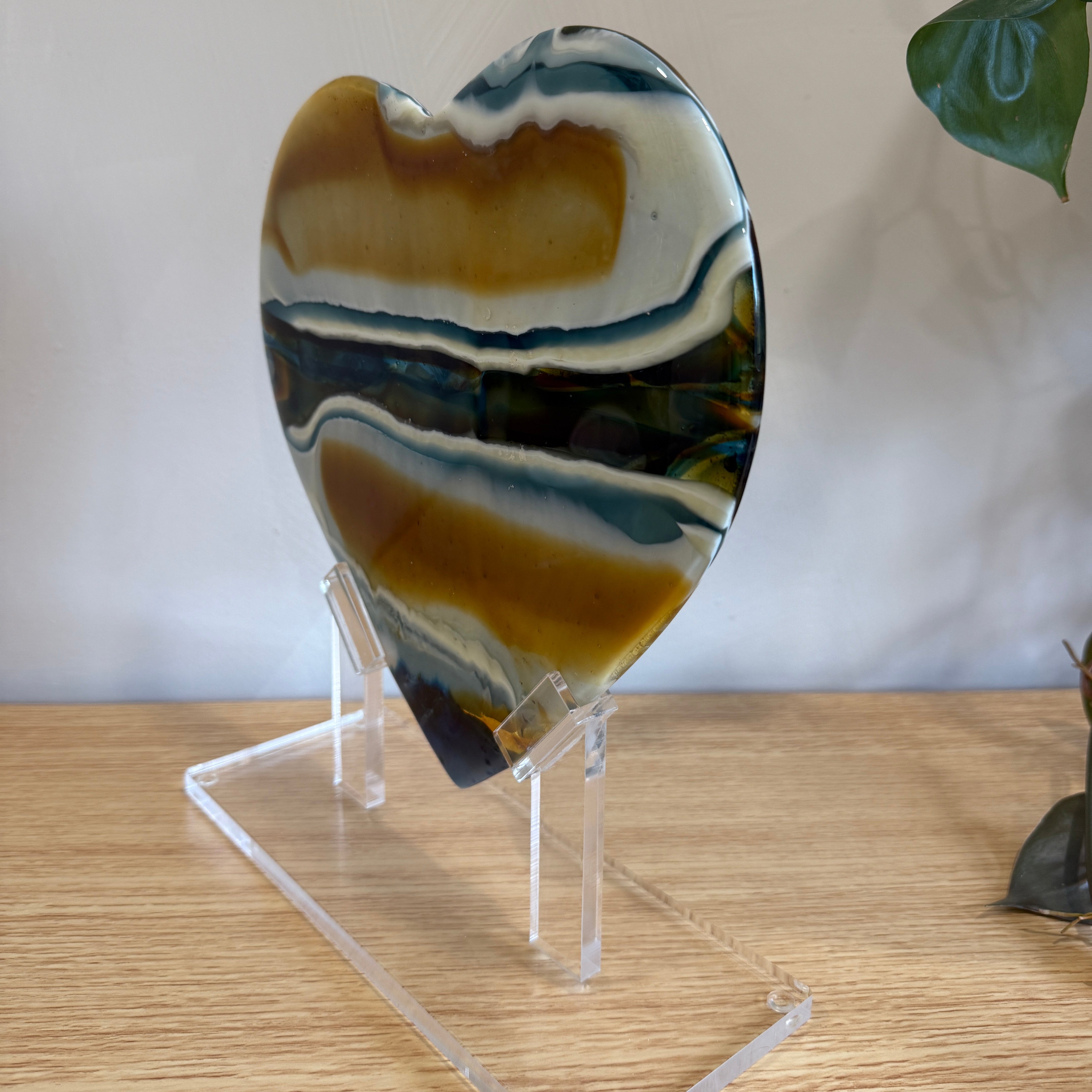 This large heart blends amber, honey, and deep navy blue glass, using both opaque and translucent layers to create dramatic color and light. No two hearts are ever the same.