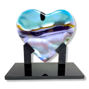 Our celestial fused glass heart sculptures are one of a kind and completely handmade in California. This heart is made by a process of dripping melted glass over metal rods then boiling. . . Read More >