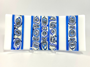 Our Cyclades tray is compromised on nine horizontal strips, of which four are an opaque clouded white. Due to the transparency of the blue strips however, refractive patterns occur on the surface beneath this artwork, enticing more happenstance patterns as it interacts with its environment.